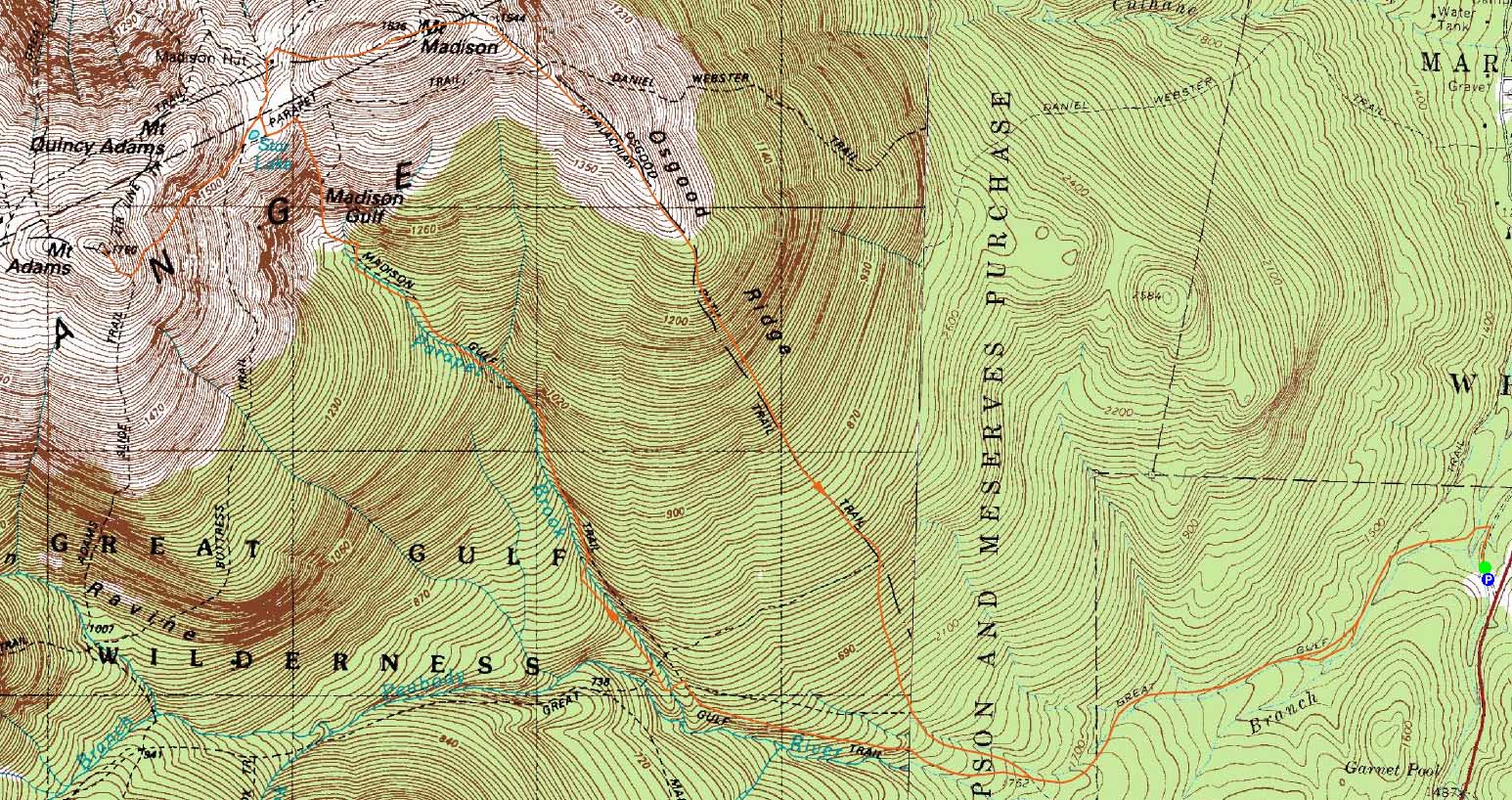Route: Great Gulf Trail, Madison Gulf Trail, Parapet Trail, Star Lake Trail, (Mt. Adams), Star Lake Trail, Osgood Trail, (Mt. Madison), Osgood Trail, Great Gulf Trail