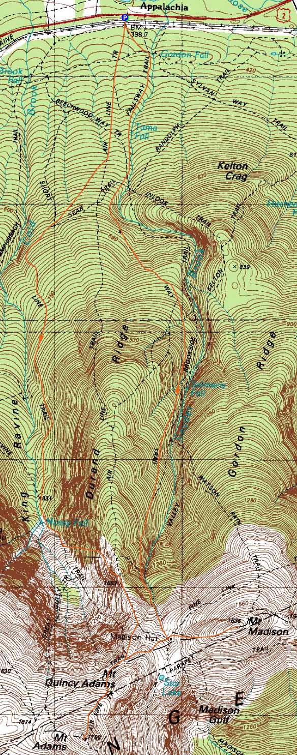 Route: Air Line, Short Line, King Ravine Trail, Chemin Des Dames, Air Line, (Mt. Adams), Air Line, Gulfside Trail, Osgood Trail, (Mt. Madison), Osgood Trail, Valley Way, Fallsway