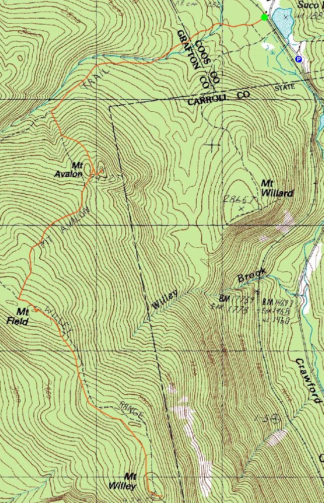 Route: Avalon Trail, (spur trail to summit), (Mt. Avalon), (spur trail from summit), Avalon Trail, Willey Range Trail, (Mt. Field), Willey Range Trail, (Mt. Willey), Willey Range Trail, (Mt. Field), Willey Range Trail, Avalon Trail