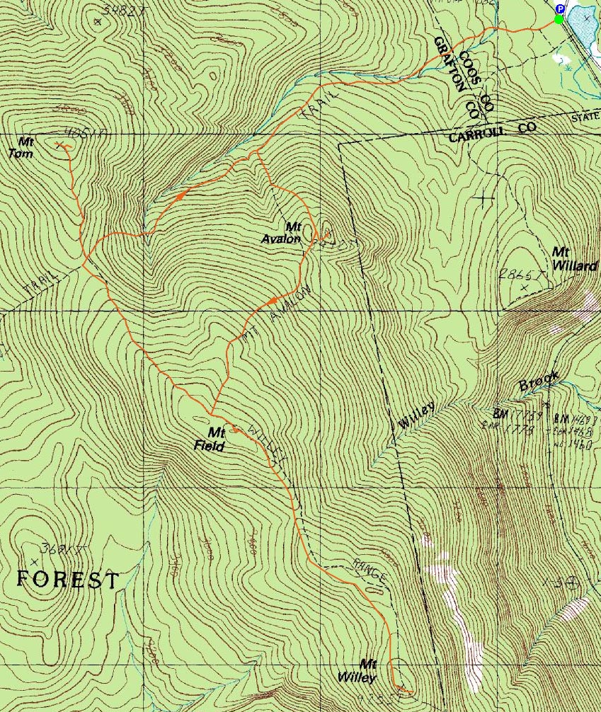 Route: Avalon Trail, (spur trail to summit), (Mt. Avalon), (spur trail from summit), Avalon Trail, Willey Range Trail, (Mt. Field), Willey Range Trail, (Mt. Willey), Willey Range Trail, (Mt. Field), Willey Range Trail, A-Z Trail, Mt. Tom Spur Trail, (Mt. Tom), Mt. Tom Spur Trail, A-Z Trail, Avalon Trail