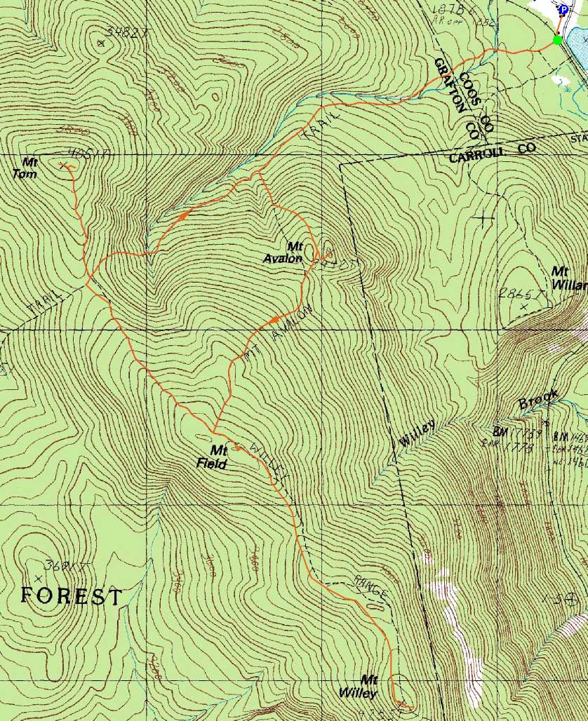 Route: Avalon Trail, (spur trail to summit), (Mt. Avalon), (spur trail from summit), Avalon Trail, Willey Range Trail, (Mt. Field), Willey Range Trail, bushwhack, Willey Range Trail, (Mt. Willey), Willey Range Trail, bushwhack, Willey Range Trail, (Mt. Field), Willey Range Trail, A-Z Trail, Mt. Tom Spur Trail, (Mt. Tom), Mt. Tom Spur Trail, A-Z Trail, Avalon Trail