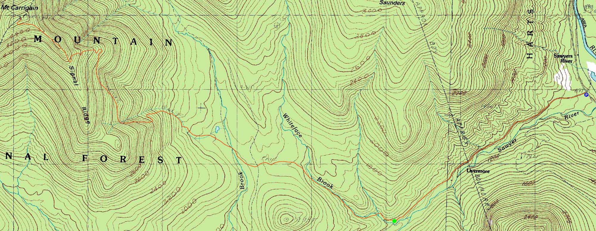Route: Sawyer River Road, Signal Ridge Trail, bushwhack, (Mt. Carrigain), Signal Ridge Trail, Sawyer River Road, herdpath