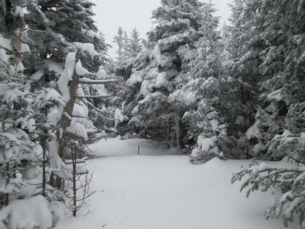 Eventually reaching softwoods (a few icy areas near small cliffs), some pockets had belt deep snow. We hit a few brief thicker areas, as well as occasional blowdown, but otherwise had pretty good going all the way to the recognized highpoint. Snow flurries obscured the near summit views.