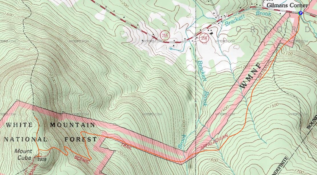 Directions to trailhead: Take Route 25A West from Wentworth. Shortly after passing a camp and some ponds on the left, and immediately after crossing a small bridge, a small dirt parking area will be on the left. The Mt. Cube Trail trailhead is here as well.