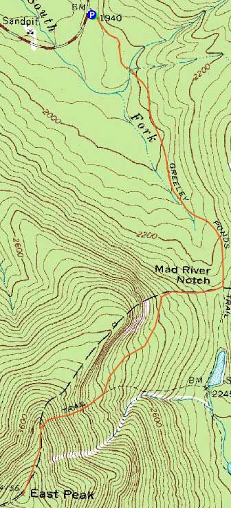 Directions to trailhead: Take Route 112 west from Conway. After passing the Hancock Trail trailhead and parking lot, the Greeley Ponds trailhead and WMNF fee parking area will be on the left a few minutes later.