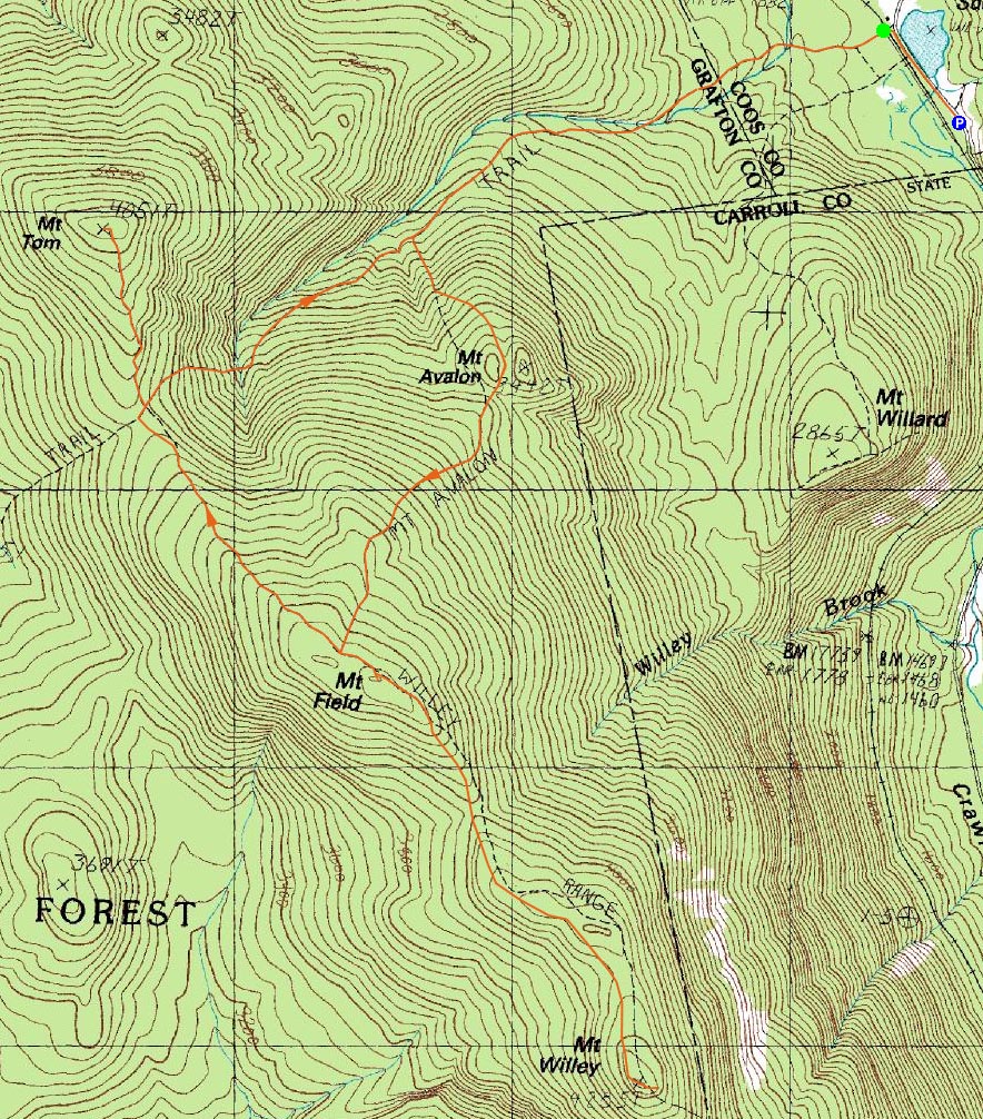 Route: Avalon Trail, (spur trail to summit), (Mt. Avalon), (spur trail from summit), Avalon Trail, Willey Range Trail, (Mt. Field), Willey Range Trail, (Mt. Willey), Willey Range Trail, (Mt. Field), Willey Range Trail, A-Z Trail, Mt. Tom Spur Trail, (Mt. Tom), Mt. Tom Spur Trail, A-Z Trail, Avalon Trail