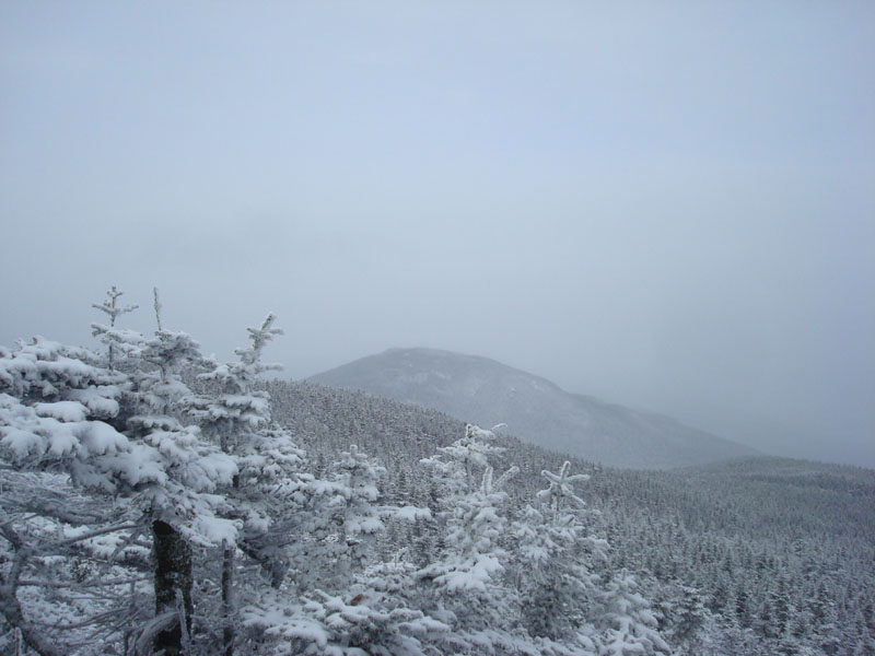 After regrouping at the summit, we made our way down the Willey Range Trail to Mt. Willey. A few sections of the trail had drifted nicely - fortunately I had been out on this stretch a few times before, as the trail was virtually gone in a few key turns (which could really use some blazes). Just prior to reaching the Mt. Willey summit, we were treated to some decent views of Mt. Carrigain, which was donning a small cloud around its summit.