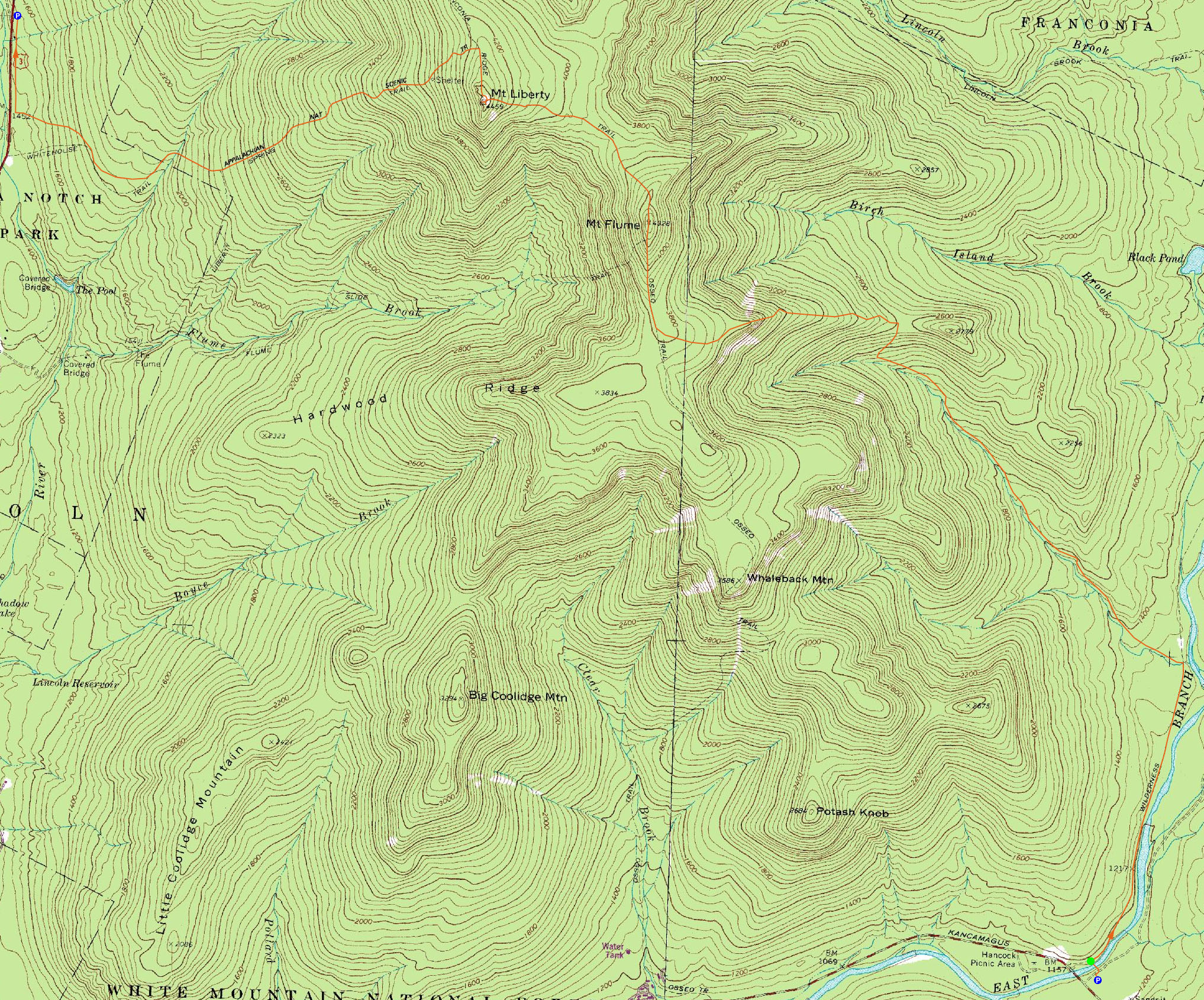 Directions to trailhead: Take Route 112 East from I-93 past Loon to the Lincoln Woods WMNF fee parking area (left side of road). End of hike parking was at the Basin WMNF fee area, off I-93, a few exits north of the Route 112 exit.