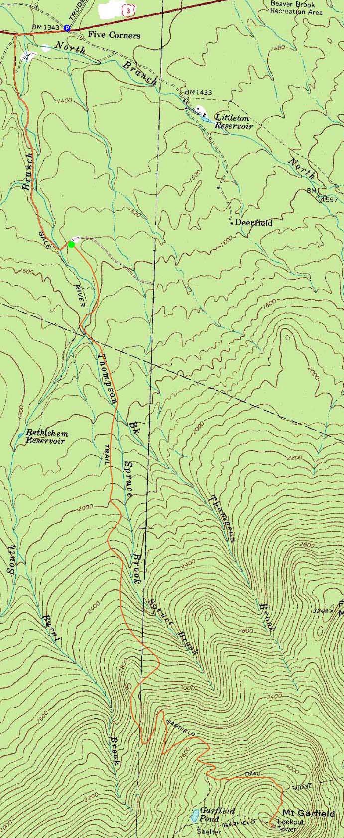 Directions to trailhead: Take US 3 South from US 302. In winter 2009-10, one could park (on the right heading southbound) at the Trudeau Road-US 3 junction, then walk southbound on US 3, taking a left onto Gale River Road. The Garfield Trail is 1.2 miles up Gale River Road, on the right shortly after the forth bridge.