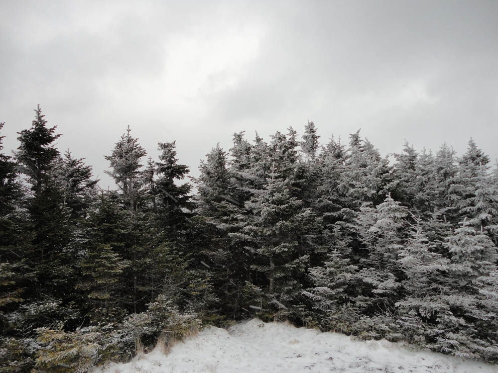 After a few brief steep sections and a few false heights of land, I eventually reached the summit of Hale in the middle of a light snow squall. With that, the normally mediocre at best views were zilch, resulting in a very short stay on the summit.