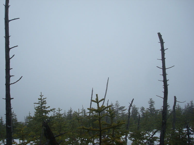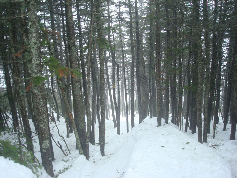 Once we regrouped at the junction, we descended to the brook crossing and then started the very steep ascent up to the north peak. While breaking trail to this point hadn't been overly taxing, trying to pull oneself up the steep terrain with somewhat deep, crusted granular in the rain was not particularly the highlight of the hike. The trail seemed to keep going and going prior to finally reaching the summit. Due to the weather, there was nothing to see from the wet, windy summit.