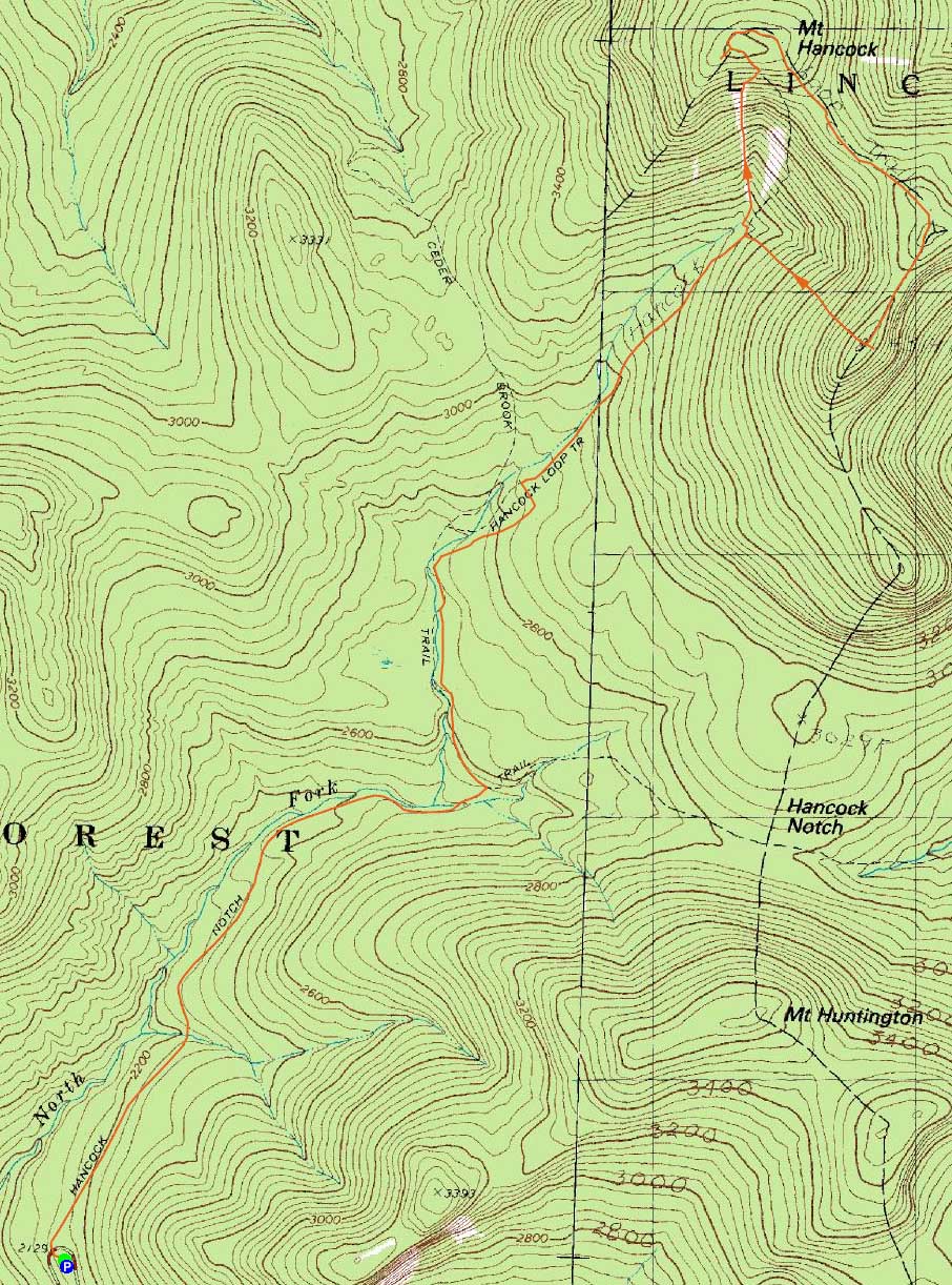 Route: Hancock Notch Trail, Cedar Brook Trail, bushwhack, Hancock Loop Trail, bushwhack, Arrow Slide, bushwhack, (Mt. Hancock North Peak), Hancock Loop Trail, (Mt. Hancock South Peak), Hancock Loop Trail, bushwhack, Cedar Brook Trail, Hancock Notch Trail