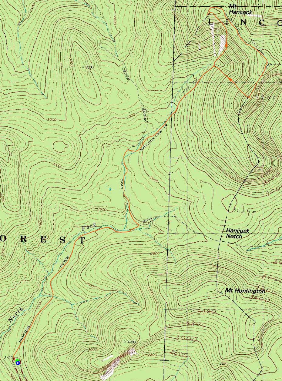 Route: Hancock Notch Trail, Cedar Brook Trail, Hancock Loop Trail, (Mt. Hancock North Peak), Hancock Loop Trail, (Mt. Hancock South Peak), Hancock Loop Trail, Cedar Brook Trail, Hancock Notch Trail