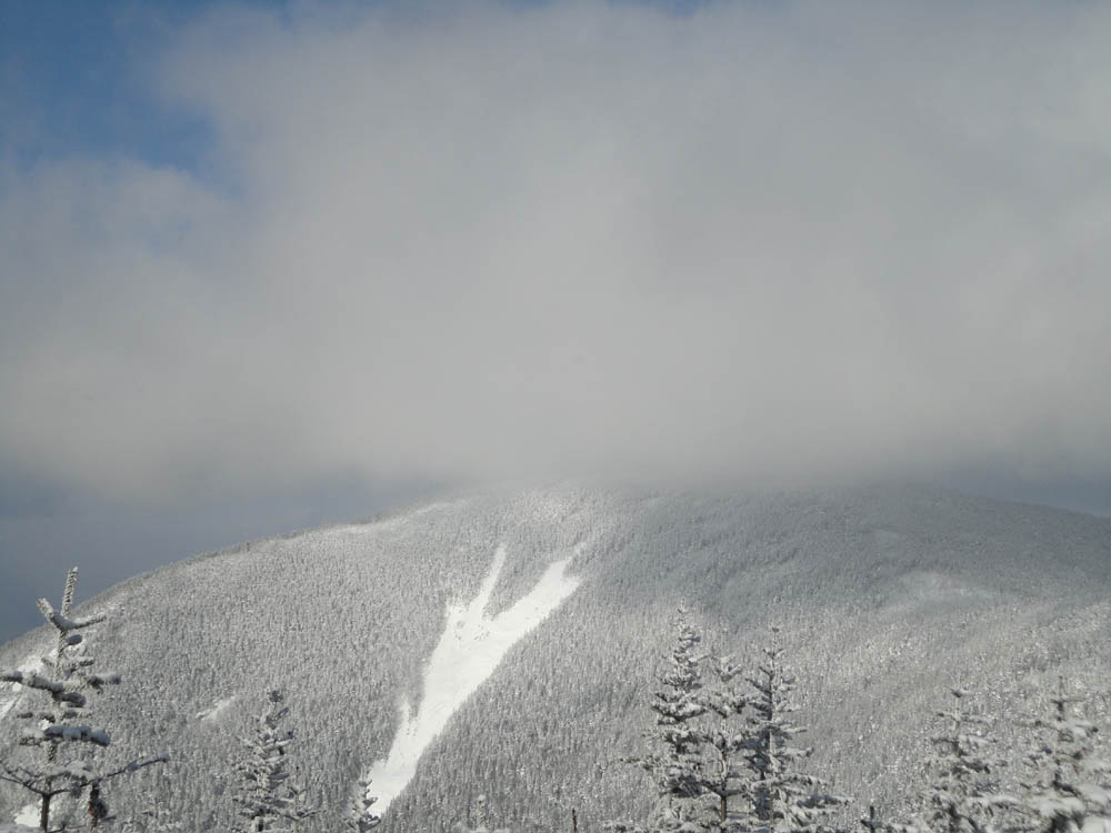 Thanks to the recent snow and subsequent hikers, the Hancock Notch and Cedar Brook Trails featured packed powder conditions. By the time we reached the Hancock Loop Trail, there were a few inches of new snow. Reaching the summit of North Hancock, views were a little bit restricted due to passing flurries.