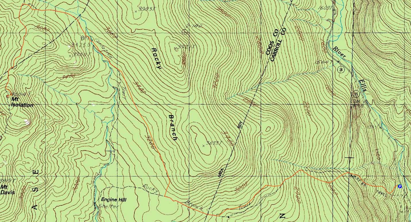 Route: Rocky Branch Trail, (Engine Hill bushwhack), Isolation Trail, (bushwhack), Davis Path, Isolation Spur, (Mt. Isolation), Isolation Spur, Davis Path, (bushwhack), Isolation Trail, (Engine Hill bushwhack), Rocky Branch Trail