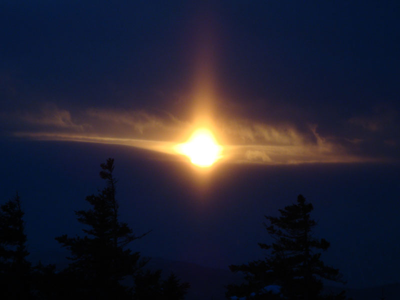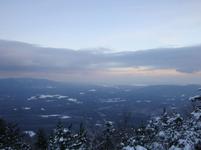 Back at the summit, I could see the actual sunset would not be on display tonight, so I continued past the cairn and back down the Wentworth Trail. Despite the lack of actual sunset, there were some nice colors to the south throughout most of the descent, ranging from pinks to oranges. Though there was no moonlight, the snow provided enough light for me to make it back without using a headlamp.