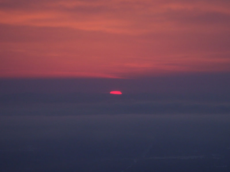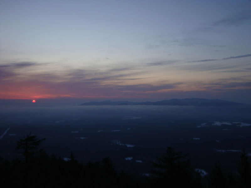After passing the water crossings, I turned off my headlamp and continued my ascent by moonlight. As I climbed, I noted what seemed to be fresh moose tracks. Reaching the false summit, I heard some walking ahead of me - the crunching of my snowshoes on the frozen granular snow must have woken him (or her) up. As I neared the summit, I noted the tracks descended down the Mead Trail - smart moose! Reaching the summit, I could see some great colors in the horizon. Reaching my favorite northeast view ledge, I was pleased to see an undercast had settled in the valley, making the Ossipee Mountains appear like an island.