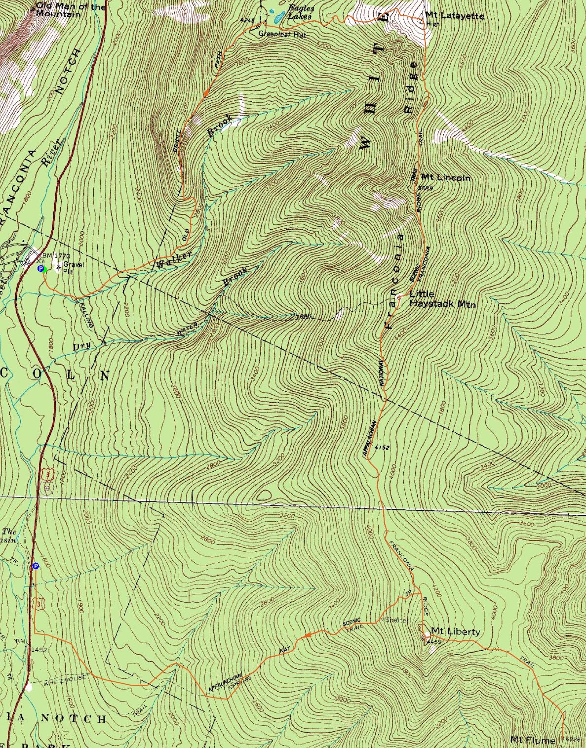 Directions to trailhead: To reach the Basin, take Interstate 93 north from Lincoln to the Basin exit. To reach the Old Bridle Path, take Interstate 93 north from Lincoln to the Lafayette Place exit. The trailhead is above the parking lot, adjacent to the outhouses.