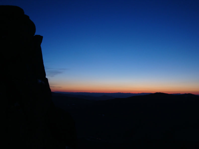 Our final peak of the day was a repeat of Mt. Liberty. After the taxing slog out of the col back to Liberty, we summitted just in time to see some beautiful sunset colors along the western horizon. Particularly interesting was an optical illusion of sorts - one of the peaks in Vermont looked like it had a large, flat object floating on it - likely a function of pressure, moisture, and some other meteorological stuff I know nothing about.