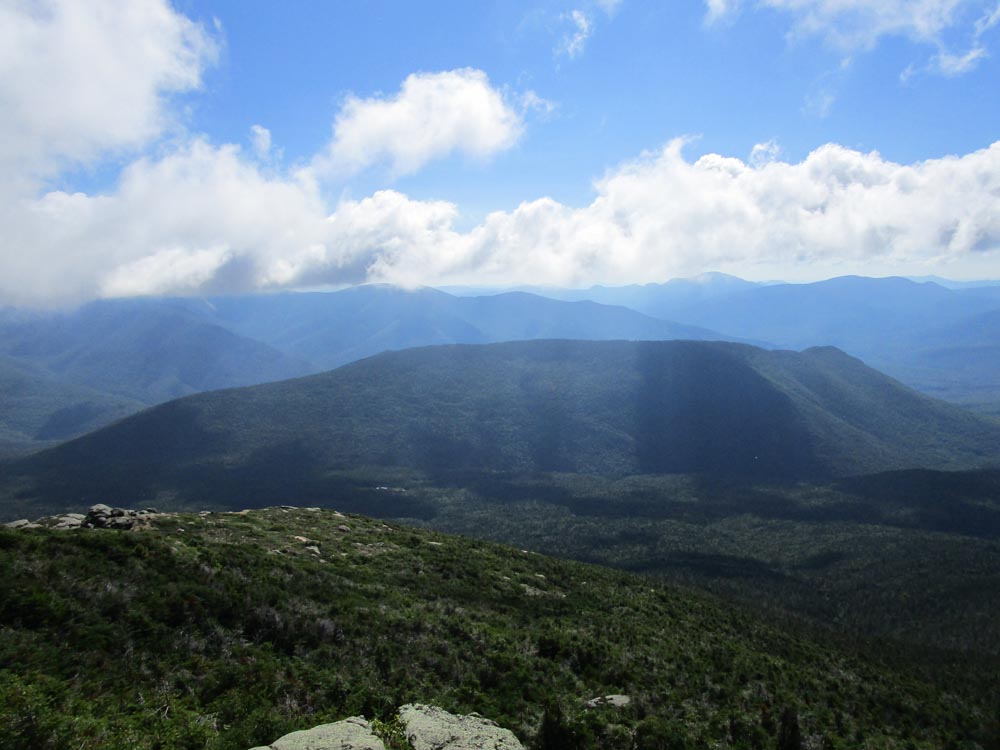 After tagging the busy summit of Lincoln, we doubled back to Truman and took the herd path (mainly rock hopping to avoid stepping on alpine growth) to the top of that finger of the Lincoln Slide. The slide was dry and loose, but nothing worse than the Tripyramid South Slide under current conditions. We continued in the brook bed at the bottom for a little while, then climbed out of the drainage (initially in scrappy woods) and into decent woods down to the ponds/marshes. Great view from the eastern pond. Decent woods from there down to the trail.