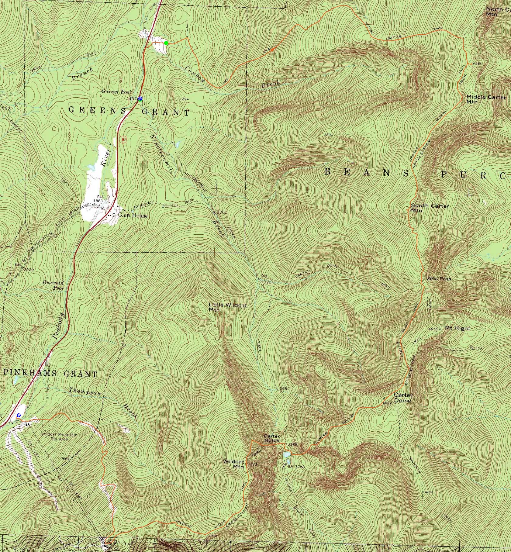 Route: Route 16, Camp Dodge road, unknown trail, Imp Trail, North Carter Trail, Carter-Moriah Trail, bushwhack, (Mt. Lethe), bushwhack, Carter-Moriah Trail, (Middle Carter Mountain), Carter-Moriah Trail, (South Carter Mountain), Carter-Moriah Trail, Carter Dome Trail, Carter-Moriah Trail, (Carter Dome), Carter-Moriah Trail, Nineteen Mile Brook Trail, Wildcat Ridge Trail, (Wildcat A), Wildcat Ridge Trail, (Wildcat B), Wildcat Ridge Trail, (Wildcat C), Wildcat Ridge Trail, (Wildcat D), Wildcat Ridge Trail, Polecat, Tomcat Schuss, Lower Polecat