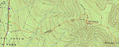 Directions to trailhead: Take Interstate 93 north from Lincoln to the Basin. Walk south down the bike path - just prior to reaching a grassy, old road on the right (where the bike path gets close to the highway), start the bushwhack on the left. After crossing a brook, an old logging road can be found a bit to the left, eventually meeting up with the hairpin turn in the Liberty Spring Trail