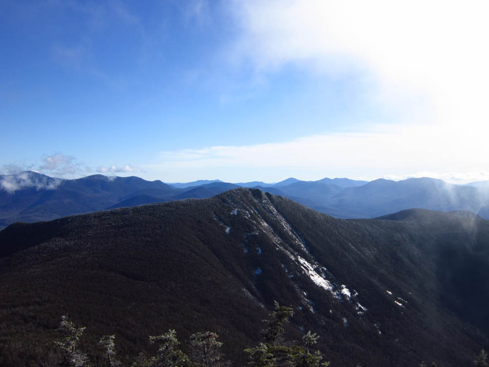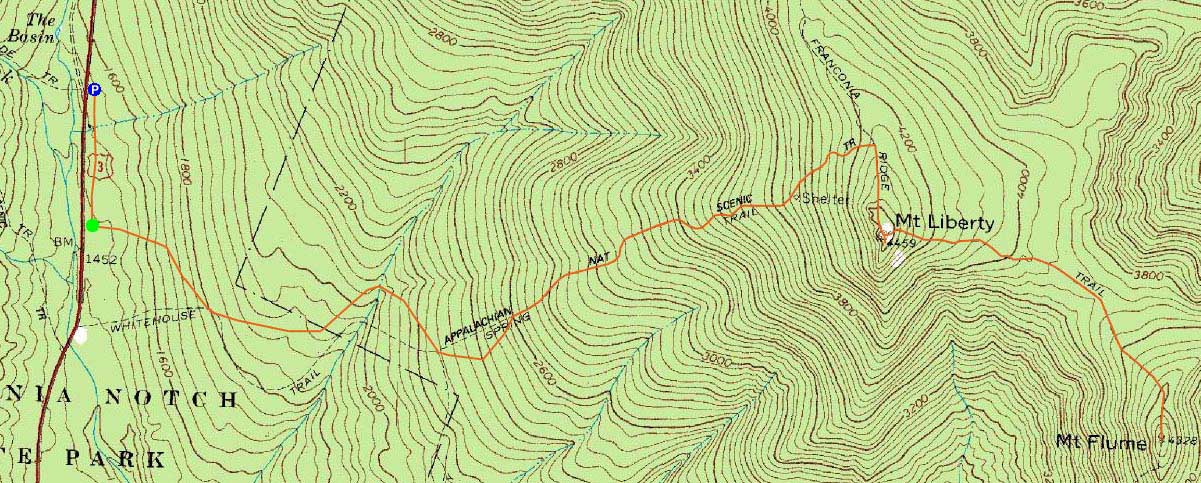 Directions to trailhead: Take Interstate 93 north from Lincoln to the Basin. Walk south down the bike path - just prior to reaching a grassy, old road on the right (where the bike path gets close to the highway), start the bushwhack on the left. After crossing a brook, an old logging road can be found a bit to the left, eventually meeting up with the hairpin turn in the Liberty Spring Trail