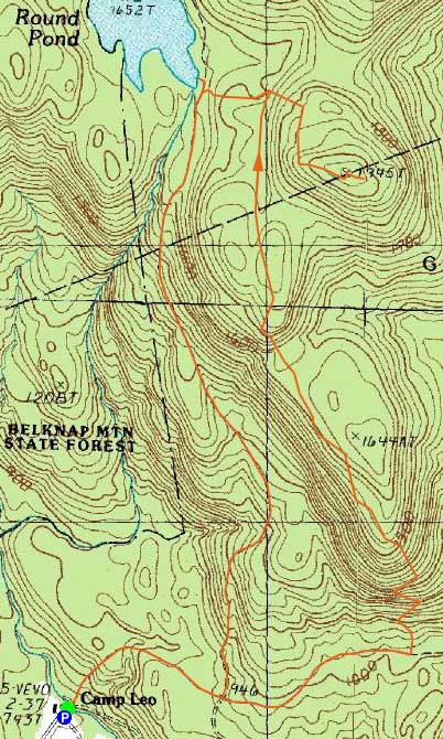 Directions to trailhead: From Route 107, take Route 140 east into Gilmanton. Take a left onto Crystal Lake Road, bearing left to stay on it (when Mountain Road goes straight). After passing Crystal Lake, the road turns into Guinea Ridge Road. Take a right next to some cabins onto Manning Lake Road (this is inaccurately labelled as Camp Leo Road and Moulton Road on some maps...the current road sign says Manning Lake Road). There is a small parking area on the left just before reaching the area with the camp buildings. The Red-Blue Trail starts at the bridge just beyond the main building, in the form of a dirt road.