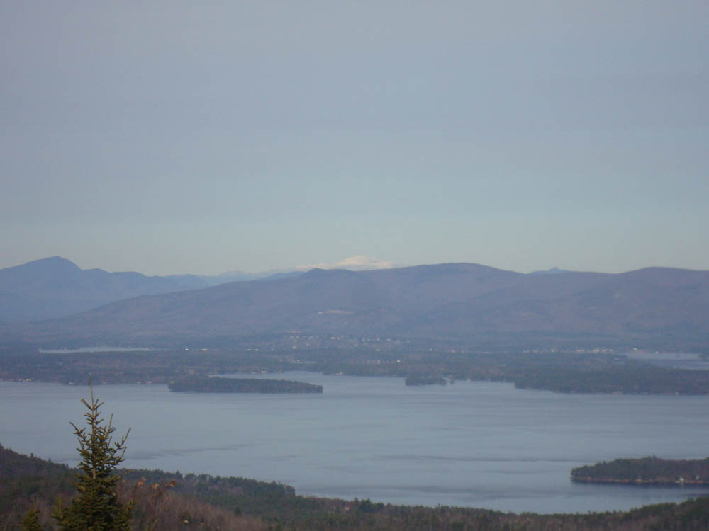 Back on the Red Trail on Mt. Klem, we headed north to the tremendous vista, from where we could see the lake, the nearer mountain ranges, and in the distance, a white Presidential Range.