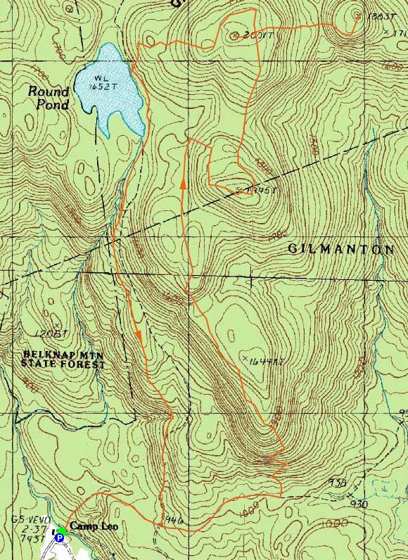Directions to trailhead: From Route 107, take Route 140 east into Gilmanton. Take a left onto Crystal Lake Road, bearing left to stay on it (when Mountain Road goes straight). After passing Crystal Lake, the road turns into Guinea Ridge Road. Take a right next to some cabins onto Manning Lake Road (this is inaccurately labelled as Camp Leo Road and Moulton Road on some maps...the current road sign says Manning Lake Road). There is a small parking area on the left just before reaching the area with the camp buildings. The Red-Blue Trail starts at the bridge just beyond the main building, in the form of a dirt road.
