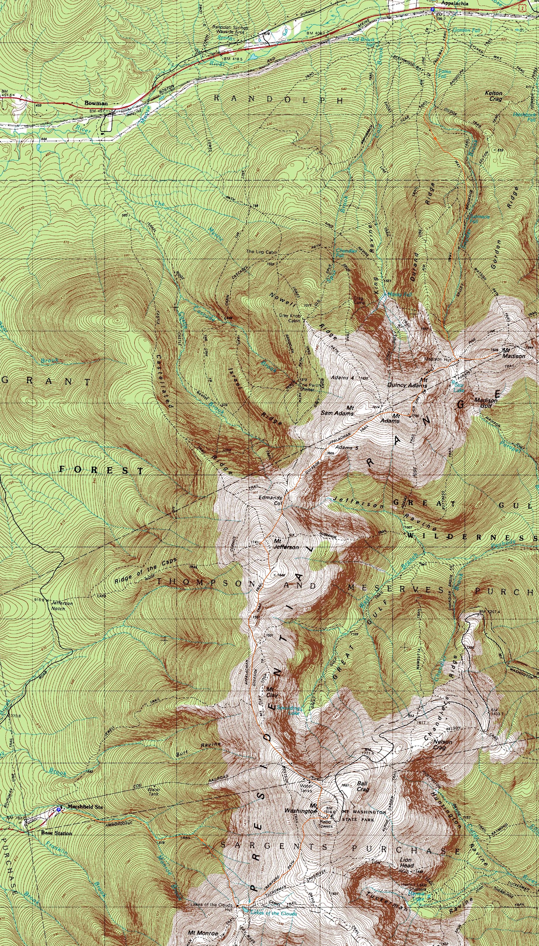 Route: Valley Way, Osgood Trail, (Mt. Madison), Osgood Trail, Gulfside Trail, Air Line Trail, (Mt. Adams), Lowe's Path, Israel Ridge Trail, Gulfside Trail, Jefferson Loop, (Mt. Jefferson), Jefferson Loop, Gulfside Trail, (Mt. Washington), Crawford Path, Ammonoosuc Ravine Trail