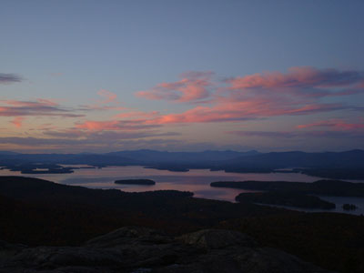 Looking out over Lake Winnipesaukee at sunset from the Mt. Major summit