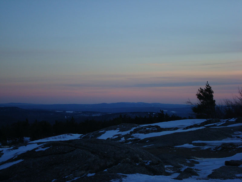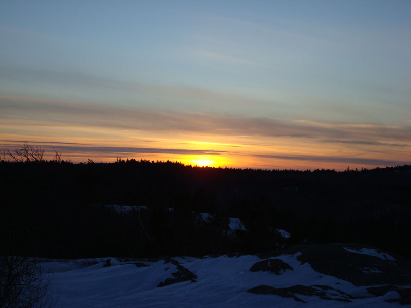 The Mt. Major Main Trail was decently packed for snowshoeing. I continued onto the Brook Trail, which is flat to moderate in pitch before arriving at the Straightback/Major Link intersection. From here, I had to break trail up to the ledges. Again, the trail is flat to moderate in pitch. The setting sun provided some great colors.