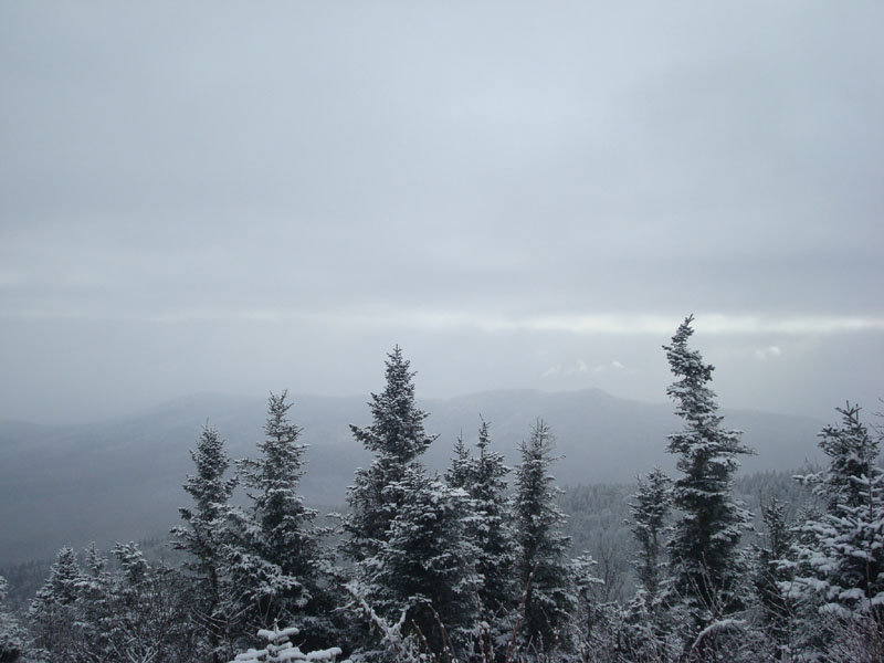 Hoping that perhaps the weather would pass through, I continued with my plan and was soon on the Cherry Mountain Trail. The first part of the trail was fairly gradual and straight - I was a bit tired and hadn't had enough for breakfast, so I was dragging. After awhile, the trail steepened up a bit, and it started snowing. By the time I reached the height of land, the surface had gone from a quarter of an inch of snow to an inch.