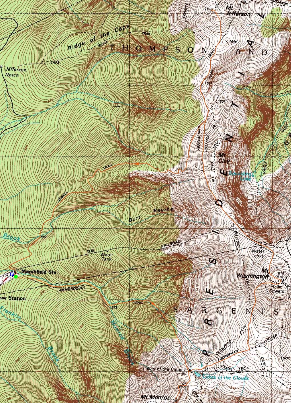 Route: Unknown trail, Ammonoosuc Ravine Trail, Mount Monroe Loop, (Mt. Monroe), Mount Monroe Loop, Crawford Path, Tuckerman Crossover, snowfield, Crawford Path, (Mt. Washington), snowfields, Gulfside Trail, Jefferson Loop, (Mt. Jefferson), Jefferson Loop, Gulfside Trail, snowfields, Jewell Trail, unknown trail