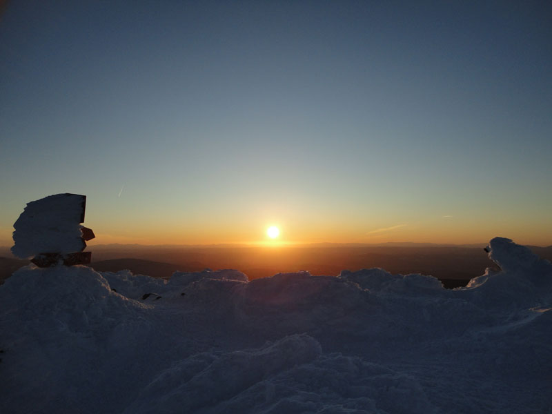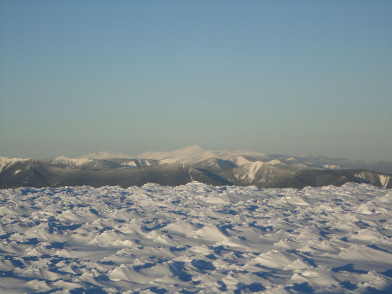 After layering up, I worked my way up the Carriage Road - I was amazed to see a cornice on the east side of the peak, something I had never observed in my three previous winter ascents. Reaching the summit, the winds were a bit chilly, but bearable. The Presidentials were in the clear, and views stretched beyond Jay Peak to the northwest and the Uncanooonucs to the south.