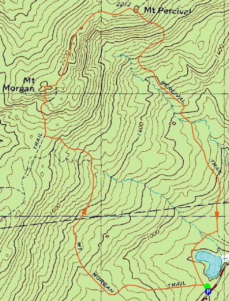 The Mt. Percival Trail was dryer and in better shape than the Mt. Morgan Trail, allowing for a decent descent. The Morse Trail, crossing from the base of the Mt. Percival Trail to the Mt. Morgan Trail, was a bit muddier, but still passable.