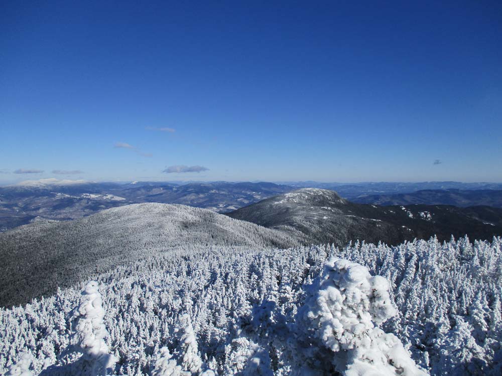 Snowshoes were very useful on the ridge, as the footbed deviates from the trail in a few open areas and postholers were doing a good job at finding spruce traps. The steep chute up to Moriah proper was pretty well filled in with only about a foot of blue ice to step over.
