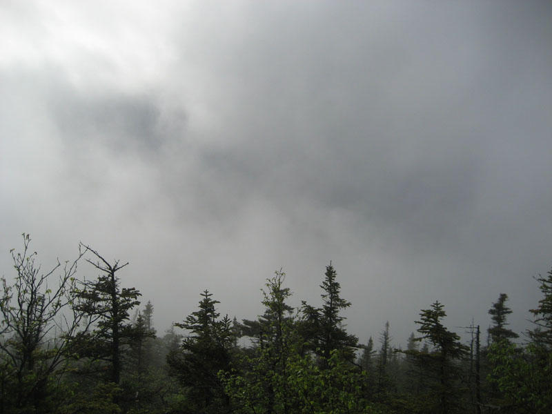 Despite the all day rain, the water crossing wasn't too bad. As I neared the Rollins Trail junction, the rain let up. Reaching the summit, I could see fog was blowing through at a decent rate. I decided to sit at the viewpoint for awhile, as the clouds were brightening up. This was short lived, however, as some darker clouds moved in.