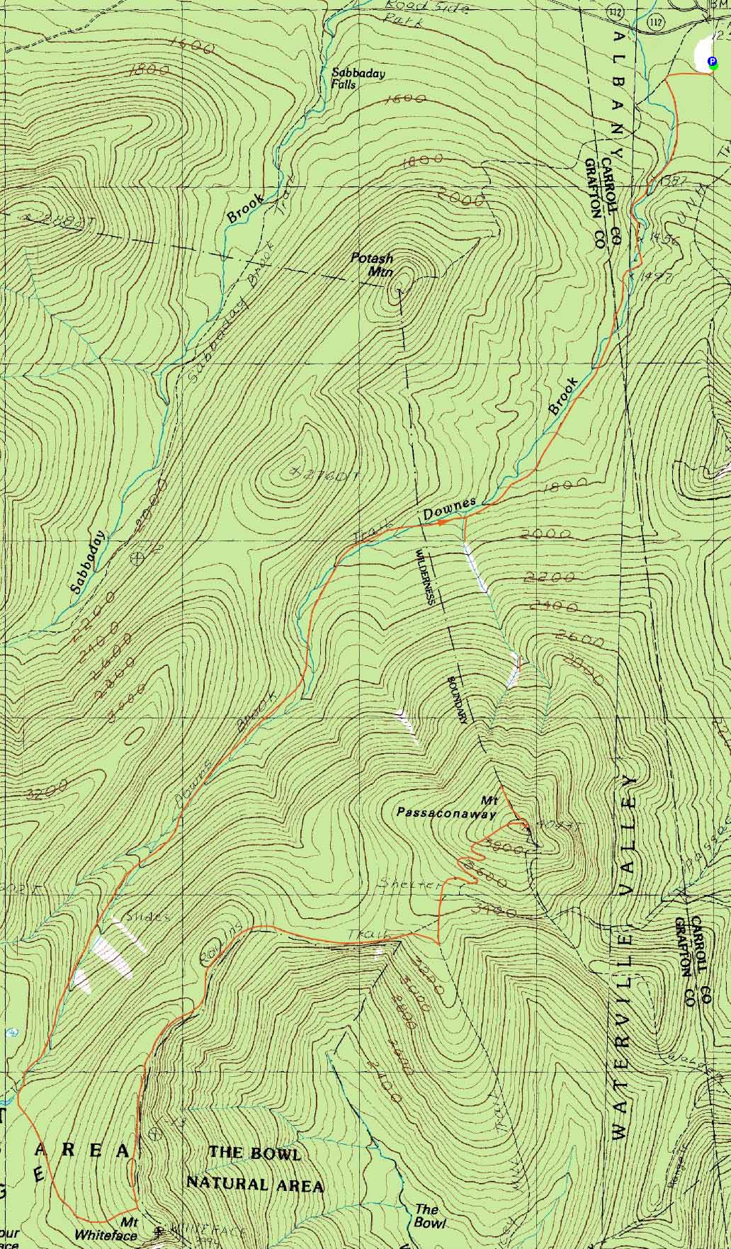 Route: Downes Brook Trail, Downes Brook Slide Trail, Walden Trail, (Mt. Passaconaway), Dicey Mill Trail, Rollins Trail, (Mt. Whiteface), Rollins Trail, Kate Sleeper Trail, Downes Brook Trail