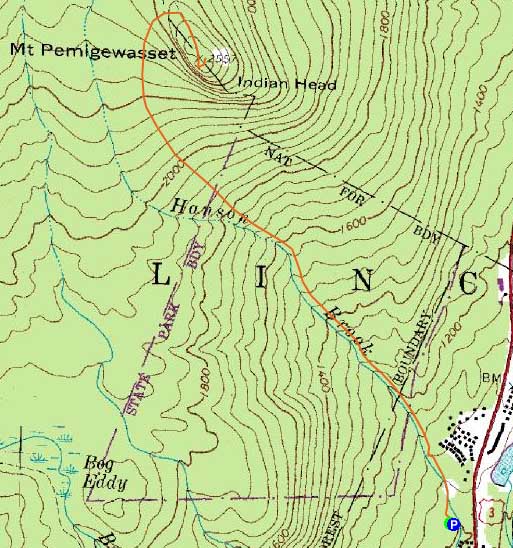 Directions to trailhead: Take I-93 north from Lincoln, to exit 33. Take US 3 north. Shortly after passing the water park, the dirt road leading to the Indian Head Trail parking lot will be on the left (sign on the right for trailhead parking). The Indian Head Trail starts at the back right of the parking lot.