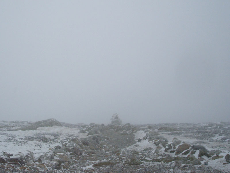 While I hadn't the full intention of ascending Eisenhower, I eventually found myself at the loop junction. At this point, since I was less than half a mile away and feeling warm, I decided to go for it. The first part of the loop trail was protected a little bit from the northwesterly winds. Once I cleared the shoulder, however, reality hit - sustained winds bearing down on me as I slowly made my way to the summit. After attempting to take a few photos in the very high winds while hiding behind the cairn, I decided to attempt to head down the Edmands Path and thus reduce my remaining above treeline hiking by about a mile. A few steps later, I realized it was going to be very tough to make it down that section of the loop trail. Since it's never good to make fast decisions with relative high stakes like this, I crouched down for a minute and thought about my options - get knocked around trying to get to the Edmands Path or try to go back the way I came, with a good 1.5 miles of exposure. Not wanting to deal with the exposed section on the northwest side of the peak, I decided to book it back down the way I came.