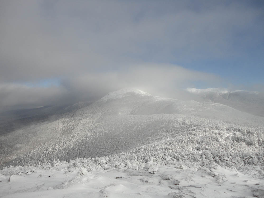 The stretch between the hut and Jackson had been largely untouched, resulting in a nice winter look. Upon reaching the summit of Mt. Jackson, we had much stronger views of the Presis than on Pierce, though nearby mountains such as Mt. Willey were still obscured by clouds.