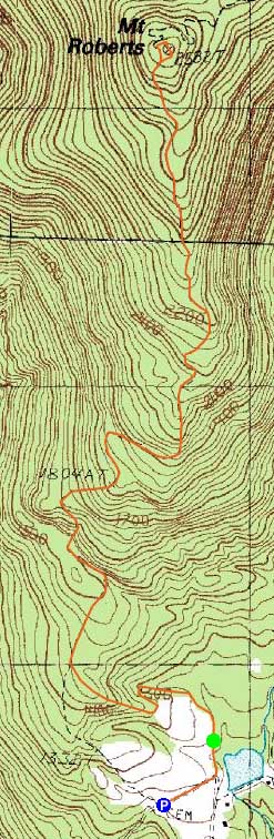 Directions to trailhead: Take Route 109 South from Route 25. Bear left onto Route 171. Shortly thereafter, take a left onto Ossipee Park Road. The small hiker parking lot is located just after the gatehouse, on the right. Continue on the road on foot, taking a left at the intersection. The Mt. Roberts Trail trailhead is located at the corner of the field near the barn.