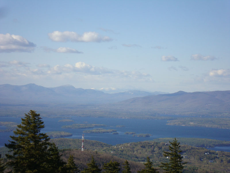 Looking at the snowcapped Presidentials, between the Sandwich Range and Ossipees, from Gunstock Mountain