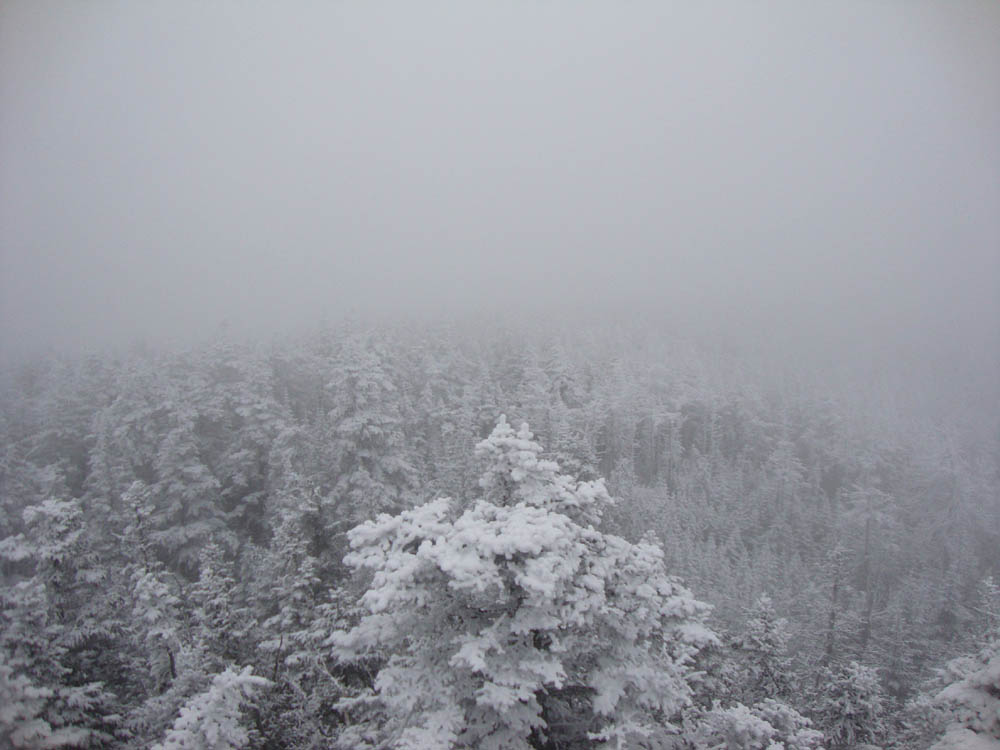 Reaching Mt. Surprise, we had cloudy, but decent views of the Presidentials. By the time we reached the summit of Mt. Moriah, we were engulfed in clouds.