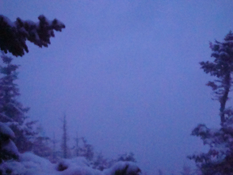 A few inches of new powder had fallen on top of a rock hard base - snowshoes seemed to be ideal for traction. A bit tired, I was dragging for much of the ascent. Reaching the ridge, visibility dropped dramatically with wind gusts. Reaching the summit, I quickly turned around and and worked my way off the ridge as soon as possible - during wind gusts, visibility was maybe 5 feet at best. With the limited light and no visible snowshoe trough (due to melting), navigating by memory in a few places.