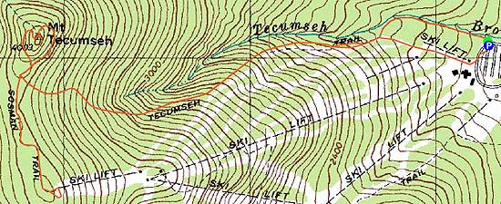 Route: Mt. Tecumseh Trail, abandoned trail, ski trails, Mt. Tecumseh Trail, Sosman Trail, (Mt. Tecumseh), Mt. Tecumseh Trail, Sosman Trail, Mt. Tecumseh Trail, ski trails