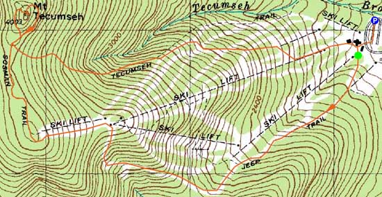 Route: Ski trails, Sosman Trail, (summit), Sosman Trail, Mt. Tecumseh Trail, ski trails