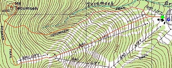 Route: Ski trails, Sosman Trail, Mt. Tecumseh Trail, (summit), Sosman Trail, Mt. Tecumseh Trail, ski trails